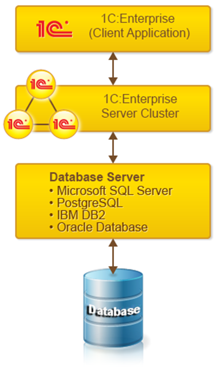 The program running on the user’s computer (the client application) interacts with the 1C:Enterprise server cluster, and the cluster, when necessary, communicates with the database server.