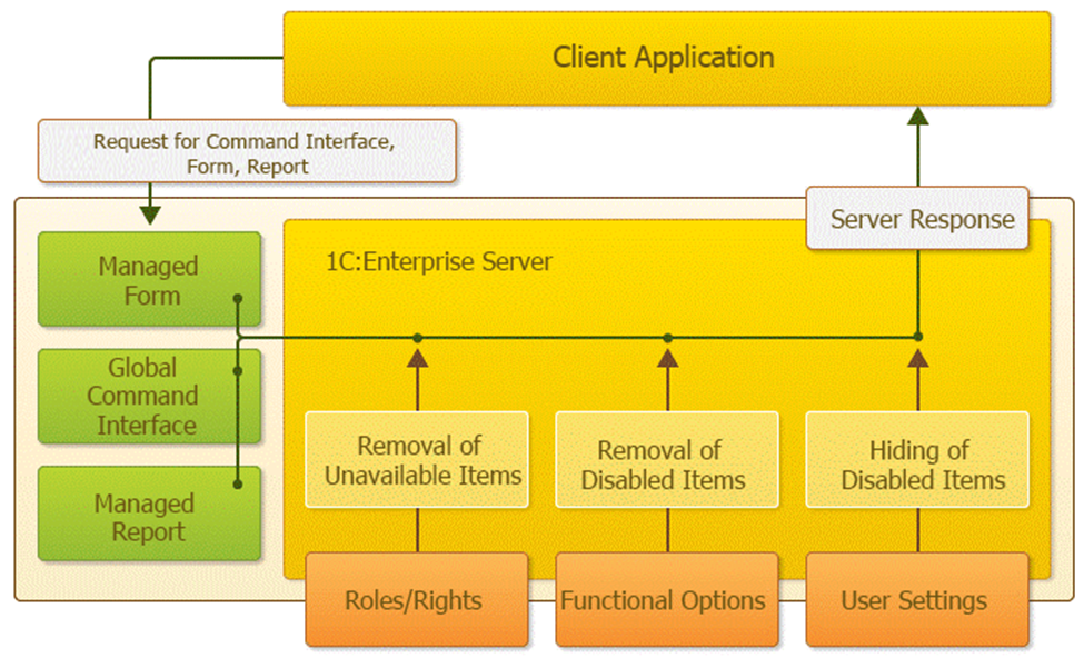 All work with application objects, database read and write operations are performed only on the server. Form functionality and command interfaces are also implemented on the server.