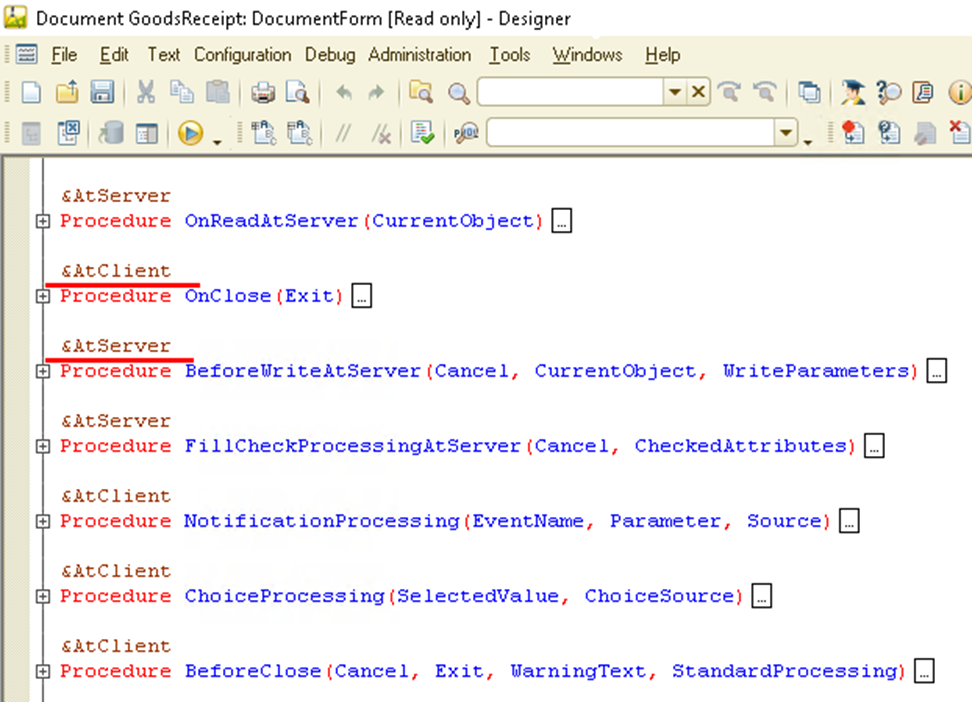However, the use of the 1C:Enterprise language on the client is strictly limited. Client procedures in modules are explicitly separated from server ones, and only a restricted subset of the 1C:Enterprise language object model is available.