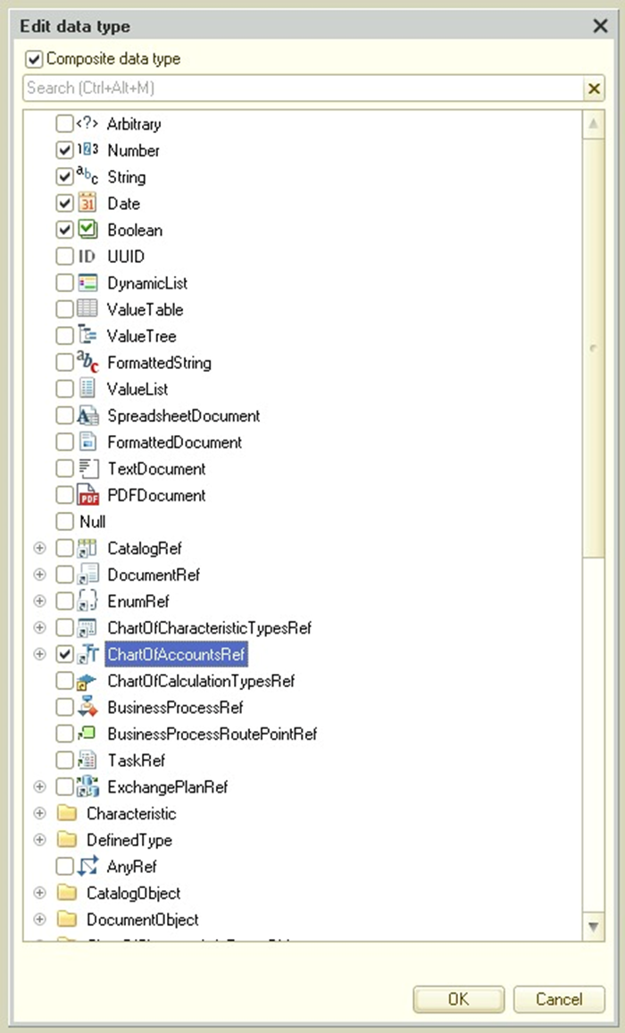 A major advantage of the 1C:Enterprise data model is that a database field may be configured to accept several data types. At any time, only one value is stored, but it can be any of the defined types. These may be reference types or primitives such as Number, String, Date, and so on.