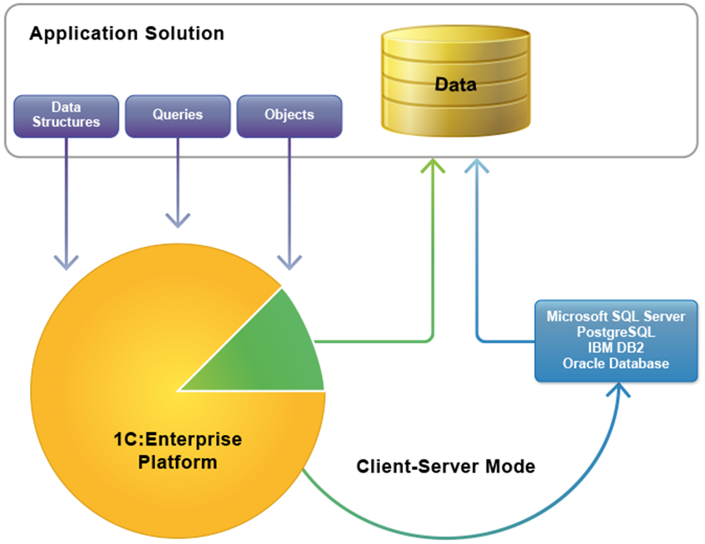 The 1C:Enterprise platform manages query execution, data structure definition, and data manipulation. It converts developer actions into the appropriate commands. These commands may be sent to a database management system (in client-server environments) or to the platform’s database engine (in file mode).