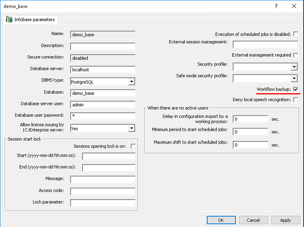Infobases with Workflow Backup enabled are called reserved. The administrator can specify which infobases require backup worker processes.