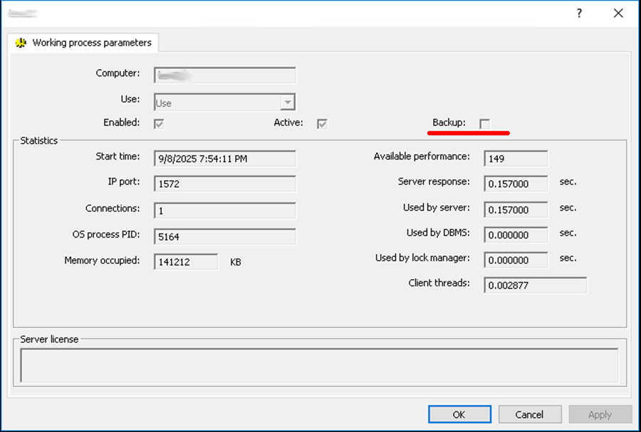 If a worker process serves as a backup, its properties show the Backup checkbox as selected. This checkbox is cleared once the worker process becomes active. See Working process parameters → Backup in the screenshot.