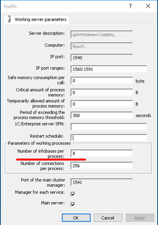 The number of backup worker processes is determined by the property Number of infobases per process in the server node parameters. See server node parameters → Number of infobases per process in the screenshot.